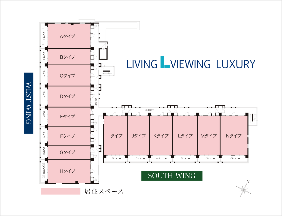 L字型に配された2つの棟が、光と風を招き入れる多彩な住まいを生み出しました。