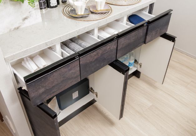 開き扉収納と2段引き出しを組み合わせることで、大きな物から細かな日用品まで効率的に整理できます。