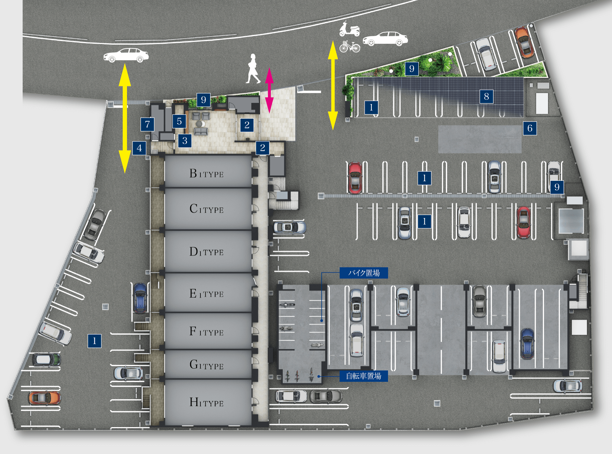 開放的な敷地の特性を存分に生かし、出入り口の動線を歩車分離とし、安全性を確保。
